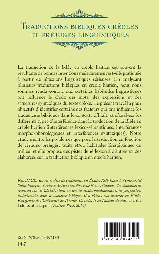Le présent travail a pour objectifs d'identifier certains des facteurs qui ont influencé les traducteurs bibliques dans le contexte d'Haïti et d'analyser les différents types d'interférence dans la traduction de la Bible en créole haïtien (interférences lexico-sémantiques, interférences morpho-phonologiques et interférences syntaxiques). Notre étude montre les problèmes que pose la traduction en fonction de certains préjugés, traits et/ou habitudes linguistiques du milieu, et elle propose des pistes de réflexion à d'autres études élaborées sur la traduction biblique en créole haïtien.