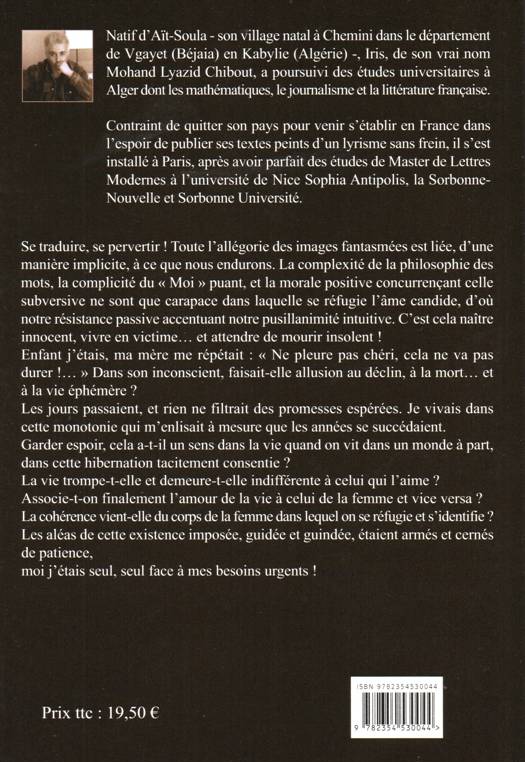 Se traduire, se pervertir… ! Toute l’allégorie des images fantasmées est liée d’une manière implicite à ce que nous endurons. La complexité de la philosophie des mots, la complicité du « Moi » puant, la morale positive concurrençant celle subversive ne sont que carapace dans laquelle se réfugie l’âme candide, d’où notre résistance passive accentuant notre pusillanimité intuitive. C’est cela naître innocent, vivre en victime et… attendre de mourir insolent ! Enfant j’étais, ma mère me répétait : « Ne pleure pas chéri, cela ne va pas durer !… » Dans son inconscient, faisait-elle allusion au déclin, à la mort et… à la vie éphémère ? Les jours passaient et rien ne filtrait des promesses espérées. Je vivais dans cette monotonie qui m’enlisait à mesure que les années se succédaient. Garder espoir, cela a-t-il un sens dans la vie quand on vit dans un monde à part, dans cette hibernation tacitement consentie ? La vie trompe-t-elle et demeure-t-elle indifférente à celui qui l’aime ? Associe-t-on finalement l’amour de la vie à celui de la femme et vice versa ? La cohérence vient-elle du corps de la femme dans lequel on se réfugie et on s’identifie ? Les aléas de cette existence imposée, guidée et guindée étaient armés et cernés de patience. Moi, j’étais seul, seul face à mes besoins urgents !