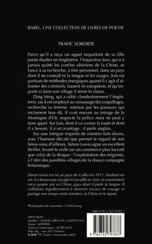 Parce qu'il a reçu un appel inquiétant de sa fille partie faire des études en Angleterre, l'inspecteur Jian, qui n'a jamais quitté les confins sibériens de la Chine, se lance à sa recherche, à titre personnel, dans un pays dont il ne connaît ni la langue ni les usages. Jian est partisan de méthodes bien à lui quand il s'agit d'affronter des criminels, fussent-ils européens, vicieux et membres de gangs se livrant au trafic d'êtres humains comme s'il s'agissait de bétail. Et qu'importe si dans son sillage il sème le chaos. Ding Ming, qui a rallié clandestinement l'Angleterre, où il est employé au ramassage des coquillages, recherche sa femme, retenue par les passeurs qui réclament leur dû. Il croit encore au mirage de la Montagne d'Or, respecte la police mais ne peut y faire appel. Sur Jian, dont il va croiser la route et dont il a besoin, il a un avantage : il parle anglais. Partant des sinistres faits divers que furent la découverte de plus de cinquante morts dans un camion transportant des immigrants chinois et la noyade de plusieurs clandestins employés au ramassage des coquillages dans la baie de Morecombe, Simon Lewis adopte la démarche opposée à celle des écrivains qui font voyager de par le monde leurs inspecteurs occidentaux, et signe un excellent thriller, levant le voile sur un commerce sordide, plus lucratif que celui de la drogue : l'exploitation des migrants, à l'abri des paisibles villages de la douce campagne britannique.