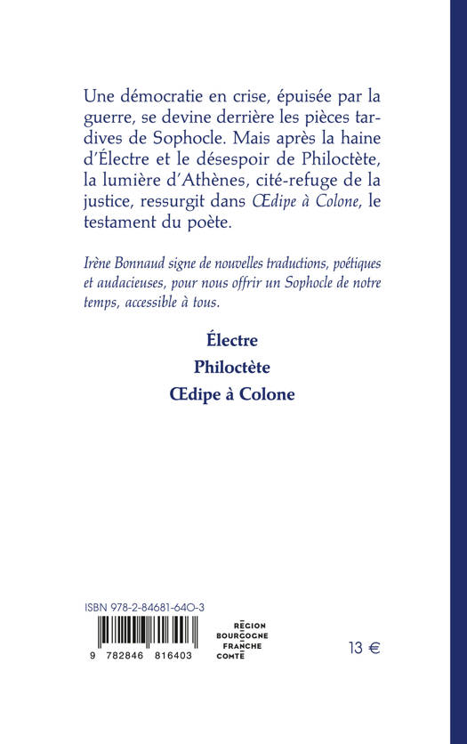 Ce second volume du théâtre complet de Sophocle présente les trois dernières pièces du dramaturge grec : Électre, Philoctète et Œdipe à Colone, dans une nouvelle traduction d’Irène Bonnaud.