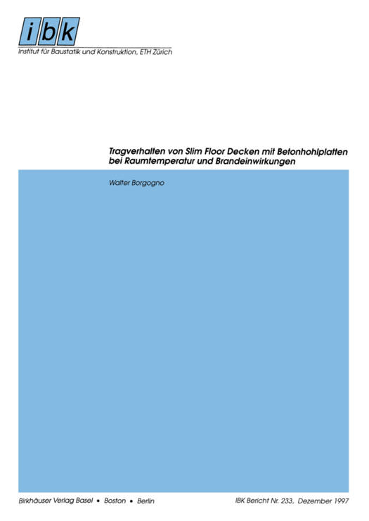 Der vorliegende von Herm Walter Borgogno als Promotionsarbeit verfasste Bericht befasst sich mit dem Tragverhalten von Slim Floor Decken mit Betonhohlplatten bei Raumtemperatur und Brandeinwirkungen. Er entstand im Rahmen eines Forschungsprojektes zur Forderung von Flachdeckensystemen in Verbundbauweise durch Bereitstellung konstruktiver Details und gesi- cherter wissenschaftlicher Grundlagen. Flachdeckensysteme in Verbundbauweise aus Betonfertigteilen und asymmetrischen Stahltr?- gem eignen sich dank der raschen und trockenen Bauweise bestens tur Geschossbauten. Bei der Auflagerung von Betonhohlplatten auf einer starren Wand ist in der Regel der Biegewider- stand massgebend. In Verbundflachdecken erfolgt die Auflagerung auf nachgiebigen Deckentr?- gern. Dadurch entsteht eine Systemtragwirkung, welche die Betonhohlplatten zus?tzlich beansprucht, sodass vermehrt der Schubtragwiderstand der Hohlplatten massgebend wird. Im Brandfall entstehen durch den starken Temperaturgradienten zudem Eigenspannungen, wel- che zu einer Reduktion des Schubwiderstandes fOhren. Im weiteren wird die Vorspannung durch die Erw?rmung der Litzen im Brandfall abgebaut und der Verbund gesch?digt. Hohlplatten wer- den im Spannbett ohne schlaffe Bewehrung und ohne spezielle Endverankerung der Spannlitzen hergestellt und besitzen relativ dOnne Stege, dadurch sind sie deutlich empfindlicher bezOglich Brandeinwirkung als normale schlaffbewehrte Betonteile.