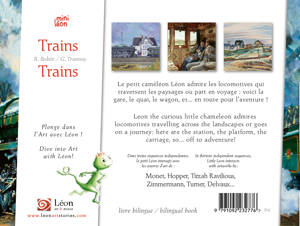 Le petit caméléon Léon explore avec curiosité l’univers ferroviaire. Il joue avec un train miniature, ou bien il admire les locomotives qui traversent les paysages. Il part aussi en voyage : voici la gare, le quai, le wagon, et... en route pour l’aventure ! Leon the curious little chameleon explores the railway world. He plays with a miniature train, or admires locomotives travelling across the landscapes. He also goes on a journey: here are the station, the platform, the carriage, so... off to adventure! â¢âDans treize séquences indépendantes, le petit Léon interagit avec les oeuvres d’art de : In thirteen independant sequences, Little Leon interacts with artworks by: Monet, Hopper, Tirzah Ravilious, Zimmermann, Turner, Delvaux...