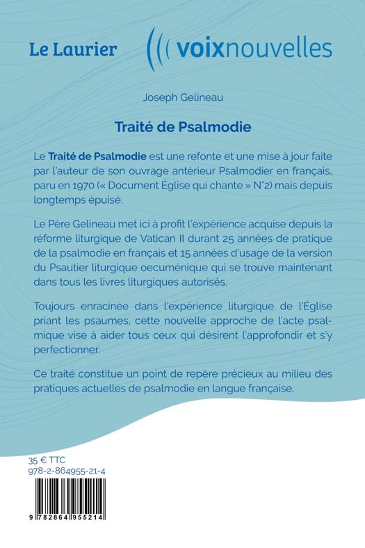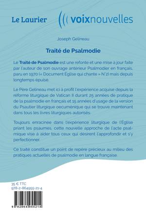 Le Père Gelineau met ici à profit l'expérience acquise depuis la réforme liturgique de Vatican II durant 25 années de pratique de la psalmodie en français et 15 années d'usage de la version du Psautier liturgique oecuménique qui se trouve maintenant dans tous les livres liturgiques autorisés.Toujours enracinée dans l'expérience liturgique de l'Église priant les psaumes, cette nouvelle approche de l'acte psalmique vise à aider tous ceux qui désirent l'approfondir et s'y perfectionner. Ce traité constitue un point de repère précieux au milieu des pratiques actuelles de psalmodie en langue française.