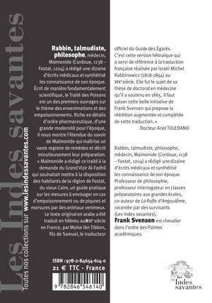 Rabbin, talmudiste, philosophe, médecin, Maïmonide (Cordoue, 1138 - Fostat, 1204) a rédigé une dizaine d’écrits médicaux et synthétisé les connaissance de son époque. Ecrit de manière fondamentalement scientifique, le Traité des Poisons est un des premiers ouvrages sur le thème des envenimations et des empoisonnements. Riche en détails d'ordre pharmaceutique, d’une grande modernité pour l’époque, il nous montre l'étendue du savoir de Maïmonide qui maîtrise un vaste registre de remèdes et décrit minutieusement leur préparation.