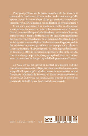 Pourquoi prelever sur la masse considerable des textes qui traitent de la confession clericale et des cas de conscience qu'elle a poses ce petit livre sans doute redige par un franciscain presque inconnu, vers 1265, sans aucune consideration doctrinale directe ? C'est qu'il constitue, a sa modeste echelle, un document " exceptionnel et normal ", selon le fameux oxymore d'Edoardo Grendi, rendu celebre par Carlo Ginzburg: enracine en Toscane, entre Florence et Sienne, il offre environ 150 cas de la vie quotidienne des citoyens et des marchands, poses dans un cadre plus ethique et social que strictement religieux. Sur le commerce, il apporte parfois des precisions inconnues par ailleurs, par exemple sur la culture et la vente du safran de San Gimignano, ou sur le negoce des chevaux en Toscane. Il offre un document de premier ordre sur la soccida, contrat d'elevage, espece du metayage, qui nait alors en Toscane avant de connaitre un long et capital developpement en Europe. Le Livre des cas est suivi d'un contrat de donation et d'une consultation, sans doute rediges par Chiaro, de Decisions curiales, auxquelles il a participe et de deux textes de son confrere et ami franciscain Manfredo de Tortona, un Traite sur les restitutions et un autre Sur la diversite des contrats, ainsi que par un extrait du franciscain Guiral Ot, Sur la necessite des marchands.