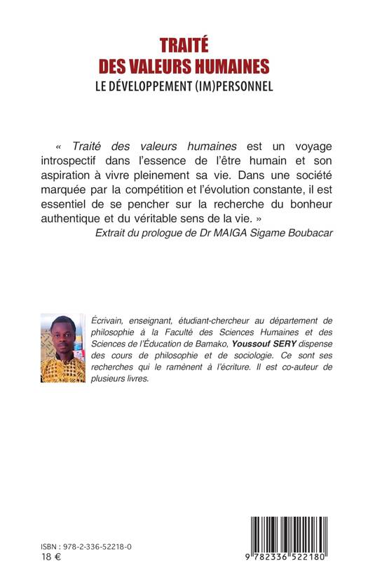 "Traité des valeurs humaines est un voyage introspectif dans l'essence de l'être humain et son aspiration à vivre pleinement sa vie. Dans une société marquée par la compétition et l'évolution constante, il est essentiel de se pencher sur la recherche du bonheur authentique et du véritable sens de la vie." Extrait du prologue de Dr MAIGA Sigame Boubacar