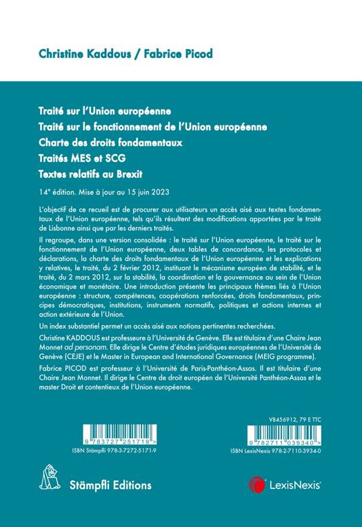 L'objectif de ce recueil est de procurer à ses utilisateurs un accès aisé aux textes fondamentaux de l'Union européenne, tels qu'ils résultent des modifications apportées par le traité de Lisbonne ainsi que par les derniers traités. Il regroupe, dans une version consolidée, le traité sur l'Union européenne, le traité sur le fonctionnement de l'Union européenne, les protocoles et déclarations, la charte des droits fondamentaux de l'Union européenne et les explications y relatives, le traité, du 2 février 2012, instituant le mécanisme européen de stabilité, le traité, du 2 mars 2012, sur la stabilité, la coordination et la gouvernance au sein de l'Union économique et monétaire, et les principaux documents relatifs au Brexit, dont l'accord sur le retrait. Une introduction présente les principaux thèmes liés à l'Union européenne : structure, compétences, coopérations renforcées, droits fondamentaux, principes démocratiques, institutions, instruments normatifs, politiques, et actions internes et action extérieure de l'Union. Elle rend compte des étapes principales du processus du retrait du Royaume-Uni de l'Union européenne et du cadre général des relations futures. Un index substantiel permet un accès aisé aux notions pertinentes recherchées. Mis à jour au 15 juin 2023.