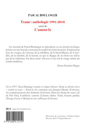 Voici un livre « impossible » pour un « petit » éditeur : une anthologie d'un poète français vivant (ah ! s'il avait été Américain... et mort... de tuberculose !), en 368 pages cousues. Pourquoi ce livre ? Nous pensons, avec quelques-uns, que son auteur, Pascal Boulanger, est l'un des meilleurs poètes français contemporains encore en activité. Nombre de ses recueils étant épuisés en librairie, cette anthologie, choisie en étroite collaboration avec l'auteur, le prouvera. Elle est augmentée d'un recueil inédit, « L'amour là », d'un long entretien avec Gwen garnier-Duguy, et d'un appareil critique. Voici un extrait de sa préface par Gwen Garnier-Duguy : « Les recueils de Pascal Boulanger se répondent, en un choral où chaque poème est une fractale contenant la totalité du chant du poète. Empruntant tous les visages, de l'amour, de la rébellion, de la bienveillance, de la lucidité, de la sérénité, de la beauté, ce qui se dégage de ses livres ne relève pas de la séduction.