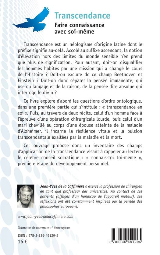 Transcendance est un néologisme d’origine latine dont le préfixe signifie au-delà. Accolé au suffixe ascendant, la notion d’élévation hors des limites du monde sensible n’en prend que plus de signification. Pour autant, doit-on disqualifier les hommes habités par une mission qui a changé le cours de l’Histoire ? Doit-on exclure de ce champ Beethoven et Einstein ? Doit-on donc séparer la pensée immanente, qui use du langage et de la raison, de la pensée dite absolue qui interroge le divin ? Ce livre explore d’abord les questions d’ordre ontologique, dans une première partie qui s’intitule : « transcendance en soi ». Puis, au travers de deux récits, celui d’un homme face à l’épreuve d’une opération chirurgicale lourde, puis celui d’un mari chevillé au corps d’une épouse atteinte de la maladie d’Alzheimer, il incarne la résilience vitale et la pulsion transcendantale exaltées par la maladie et la mort. Cet ouvrage propose donc un inventaire des champs d’application de la transcendance visant à rappeler au lecteur le célèbre conseil socratique : « connais-toi toi-même », première étape du développement personnel.