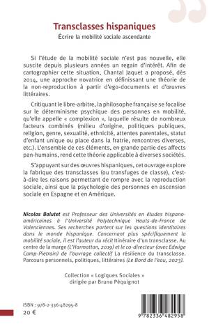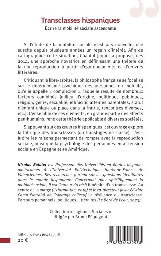 Si l’étude de la mobilité sociale n’est pas nouvelle, elle suscite depuis plusieurs années un regain d’intérêt. Afin de cartographier cette situation, Chantal Jaquet a proposé, dès 2014, une approche novatrice en définissant une théorie de la non-reproduction à partir d'ego-documents et d'œuvres littéraires. Critiquant le libre-arbitre, la philosophe française se focalise sur le déterminisme psychique des personnes en mobilité, qu'elle appelle « complexion », qui résulte de nombreux facteurs combinés (milieu d'origine, politiques publiques, religion, genre, sexualité, ethnicité, attentes parentales, statut d’enfant unique ou place dans la fratrie, rencontres diverses, etc.). L’ensemble de ces éléments, en grande partie des affects pan-humains, rendent cette théorie applicable à diverses sociétés. S’appuyant sur des œuvres hispaniques, le présent ouvrage explore la fabrique des transclasses (ou transfuges de classe), c’est-à-dire les raisons permettant de rompre avec la reproduction sociale, et la psychologie des personnes en ascension sociale en Espagne et en Amérique.