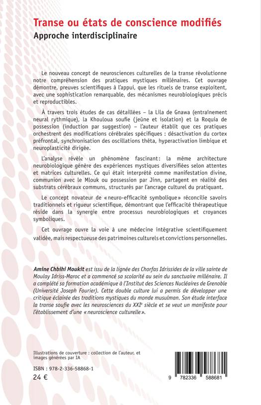 Le nouveau concept de neurosciences culturelles de la transe révolutionne notre compréhension des pratiques mystiques millénaires. Cet ouvrage démontre, preuves scientifiques à l'appui, que les rituels de transe exploitent, avec une sophistication remarquable, des mécanismes neurobiologiques précis et reproductibles. À travers trois études de cas détaillées - la Lila de Gnawa (entraînement neural rythmique), la Khouloua soufie (jeûne et isolation) et la Roquia de possession (induction par suggestion) - l'auteur établit que ces pratiques orchestrent des modifications cérébrales spécifiques: désactivation du cortex préfrontal, synchronisation des oscillations thêta, hyperactivation limbique et neuroplasticité dirigée. L'analyse révèle un phénomène fascinant la même architecture neurobiologique génère des expériences mystiques diversifiées selon attentes et matrices culturelles. Ce qui était interprété comme manifestation divine, communion avec le Mlouk ou possession par Jinn, partagent en réalité des substrats cérébraux communs, structurés par l'ancrage culturel du pratiquant. Le concept novateur de neuro-efficacité symbolique réconcilie savoirs traditionnels et rigueur scientifique, démontrant que l'efficacité thérapeutique réside dans la synergie entre processus neurobiologiques et croyances symboliques. Cet ouvrage ouvre la voie à une médecine intégrative scientifiquement validée, mais respectueuse des patrimoines culturels et convictions personnelles.