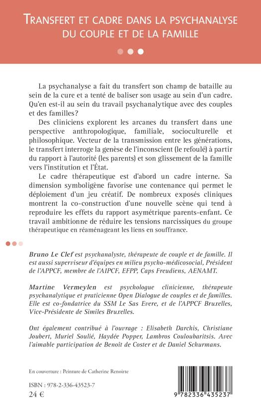 La psychanalyse a fait du transfert son champ de bataille au sein de la cure et a tenté de baliser son usage au sein d’un cadre. Qu’en est-il au sein du travail psychanalytique avec des couples et des familles ? Des cliniciens explorent les arcanes du transfert dans une perspective anthropologique, familiale, socioculturelle et philosophique. Vecteur de la transmission entre les générations, le transfert interroge la genèse de l’inconscient (le refoulé) à partir du rapport à l’autorité (les parents) et son glissement de la famille vers l’institution et l’État. Le cadre thérapeutique est d’abord un cadre interne. Sa dimension symboligène favorise une contenance qui permet le déploiement d’un jeu créatif. De nombreux exposés cliniques montrent la co-construction d’une nouvelle scène qui tend à reproduire les effets du rapport asymétrique parents-enfant. Ce travail ambitionne de réduire les tensions narcissiques du groupe thérapeutique en réaménageant les liens en souffrance.