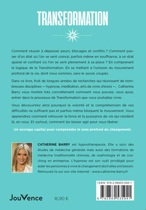 Dans ce livre, fruit de longues années de recherche, qui réunissent de nombreuses disciplines – hypnose, méditation, arts de vivre chinois — Catherine Barry vous montre très concrètement comment vous pouvez, vous aussi, entrer dans le processus de transformation que vous souhaitez vivre.