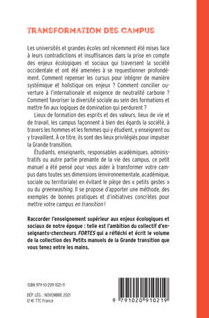Dans la lignée du "Manifeste de la grande transition", cet ouvrage propose de réfléchir la transition au sein des campus. Cette "tra nsformation des campus" concerne autant la question de la rénovation thermique des bâtiments que celle de l'évolution des maquettes pédagogiques. Le campus est sans aucun doute l'endroit où se construit l'avenir et donc où se joue et où s'accélère aujourd'hui la transformation sociale et écologique de nos sociétés. Avec Pédagogie (tp), cet ouvrage s'inscrit dans la collection des Petits manuels de la Transition publiée dans le sillage du "Manuel de la Grande Transition" et qui ont à coeur d'approfondir les enjeux clés des transitions écologique, économique, sociale et culturelle.