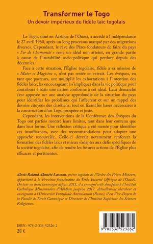 Le Togo, situé en Afrique de l'Ouest, a accédé à l'indépendance le 27 avril 1960, après un long processus marqué par des migrations diverses. Cependant, le rêve des Pères fondateurs de faire du pays l'or de l'humanité reste un idéal non atteint, en grande partie à cause de l'instabilité socio-politique qui perdure depuis des décennies. Face à cette situation, l'Église togolaise, fidèle à sa mission de Mater et Magistra, n'est pas restée en retrait. Les évêques, en tant que pasteurs, ont multiplié les exhortations à l'intention des fidèles laïcs, les encourageant à s'impliquer dans la vie politique pour contribuer à bâtir une nation conforme à cet idéal. Leur démarche s'est appuyée sur une analyse approfondie de la situation du pays pour identifier les problèmes qui l'affectent et sur un rappel des devoirs citoyens des chrétiens, tout en fixant les bases nécessaires à la construction d'un Togo prospère et juste. Cependant, les interventions de la Conférence des Évêques du Togo ont parfois montré leurs limites, tant dans leur contenu que dans leur forme. Une réflexion critique a été menée pour identifier ces insuffisances, avec des recommandations pour adopter une approche renouvelée. Celle-ci devrait notamment renforcer la formation des fidèles laïcs et mieux s'adapter aux défis spécifiques de la société togolaise, afin de rendre les futures actions de l'Église plus efficaces et pertinentes.