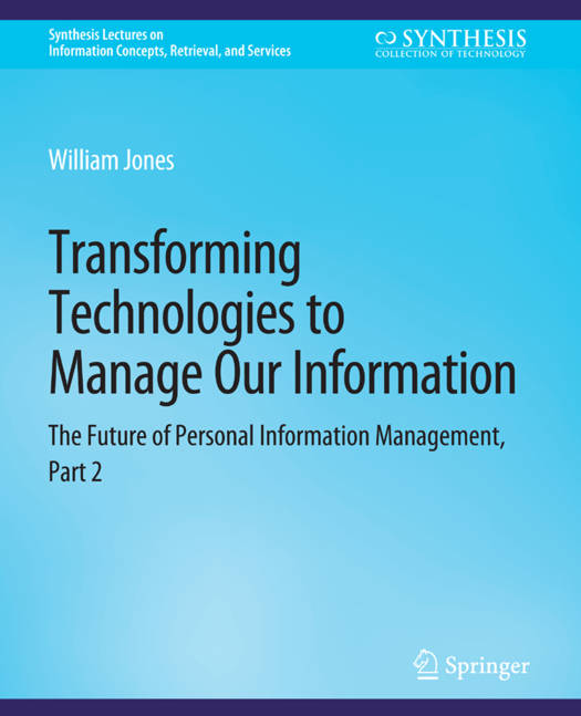 With its theme, "Our Information, Always and Forever," Part I of this book covers the basics of personal information management (PIM) including six essential activities of PIM and six (different) ways in which information can be personal to us. Part I then goes on to explore key issues that arise in the "great migration" of our information onto the Web and into a myriad of mobile devices. Part 2 provides a more focused look at technologies for managing information that promise to profoundly alter our practices of PIM and, through these practices, the way we lead our lives. Part 2 is in five chapters: - Chapter 5. Technologies of Input and Output. Technologies in support of gesture, touch, voice, and even eye movements combine to support a more natural user interface (NUI). Technologies of output include glasses and "watch" watches. Output will also increasingly be animated with options to "zoom". - Chapter 6. Technologies to Save Our Information. We can opt for "life logs" to record our experiences with increasing fidelity. What will we use these logs for? And what isn't recorded that should be? - Chapter 7. Technologies to Search Our Information. The potential for personalized search is enormous and mostly yet to be realized. Persistent searches, situated in our information landscape, will allow us to maintain a diversity of projects and areas of interest without a need to continually switch from one to another to handle incoming information. - Chapter 8. Technologies to Structure Our Information. Structure is key if we are to keep, find, and make effective use of our information. But how best to structure? And how best to share structured information between the applications we use, with other people, and also with ourselves over time? What lessons can we draw from the failures and successes in web-based efforts to share structure? - Chapter 9. PIM Transformed and Transforming: Stories from the Past, Present and Future. Part 2 concludes with a comparison between Licklider's world of information in 1957 and our own world of information today. And then we consider what the world of information is likely to look like in 2057. Licklider estimated that he spent 85% of his "thinking time" in activities that were clerical and mechanical and might (someday) be delegated to the computer. What percentage of our own time is spent with the clerical and mechanical? What about in 2057?
