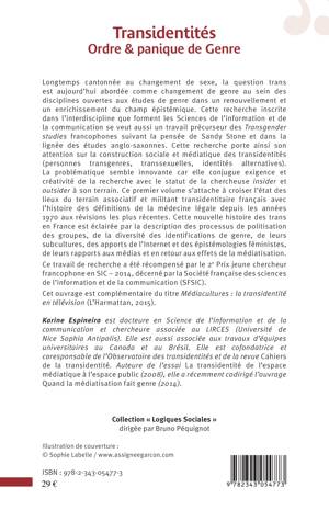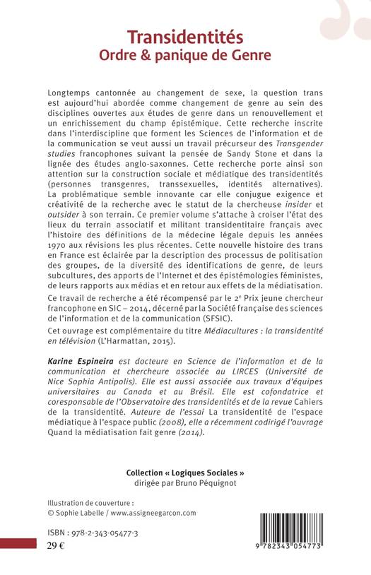 Engagée dans une recherche sur le terrain transidentitaire, la chercheuse s'attache à croiser état des lieux du terrain associatif et militant trans avec l'histoire des définitions de la médecine légale, mettant à jour la politisation des groupes, les apports des nouveaux médias et les effets de la médiatisation sur les personnes transgenres. Cet ouvrage est complémentaire du titre Médiacultures: la transidentité en télévision, édité simultanément.
