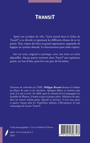 Après son accident de vélo, Tania attend dans le Salon de TransiT et se dévoile en égrainant les différents climats de sa vie passée. Dan, maître des lieux et grand organisateur, saupoudre de logique un système absurde. La réincarnation peut enfin s'opérer. Sur un texte original et poétique, avec une mise en scène dépouillée, chacun pourra retrouver dans TransiT une expérience passée, un état d'âme, peut-être une part de lui-même.
