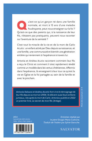 Qu'est-ce qu'un garçon né dans une famille normale, et mort à 15 ans d'une maladie foudroyante, peut nous enseigner sur la foi ? Qu'est-ce que des parents qui, à la naissance de leur fils, n'étaient pas pratiquants, peuvent nous raconter sur l'aventure de la sainteté ? C'est tout le miracle de la vie et de la mort de Carlo Acutis : un enfant attiré par Dieu depuis sa naissance, et une famille, une communauté et bientôt une génération entière qui reviennent à l'espérance à travers lui. Antonia et Andrea Acutis racontent comment leur fils a reçu le Christ et comment il s'est rapidement révélé comme un modèle dans les vertus chrétiennes. Affermis dans l'espérance, ils enseignent à leur tour ce qu'est la vie en Église et la foi partagée au sein de la famille et avec le prochain. AUTEURS Antonia et Andrea Acutis font vivre le témoignage de leur fils, depuis sa mort en 2006. Ils élèvent aussi leurs enfants jumeaux, nés après la mort de Carlo. Antonia a publié en 2022 un premier livre, Le secret de mon fils (Artège).