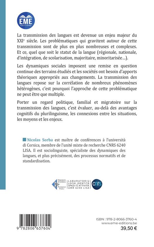 Dans un monde où les langues sont de plus en plus instrumentalisées et où seulement quelques-unes dominent, leur transmission revêt de nombreux enjeux : identitaires, politiques, économiques, migratoires. À l'aide d'approches variées, des propositions scientifiques émergent pour répondre à la problématique de la transmission des langues et se convertir en une aide aux décisions politiques.
