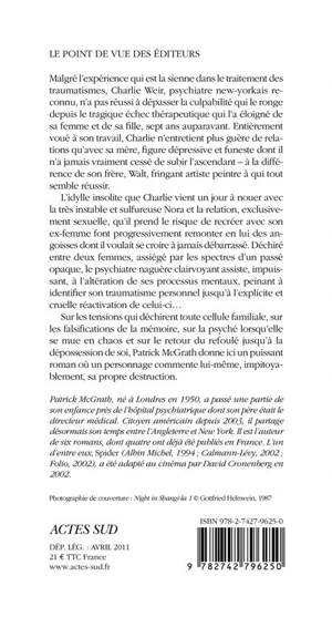 Sur les tensions qui déchirent toute cellule familiale, sur les falsifications de la mémoire, sur la psyché lorsqu'elle se mue en chaos et sur le retour du refoulé jusqu'à la dépossession de soi, Patrick McGrath donne ici un puissant roman où un personnage commente lui-même, impitoyablement, sa propre destruction.