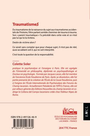 Du traumatisme de la naissance du sujet aux traumatismes accidentels de l’histoire, l’être parlant semble cheminer de trauma à trauma. Son « parent traumatique » l’a précédé dans cette voie et ce n’est pas lui qui la lui évitera.Destin de victime, alors ? Ce serait sans compter que pour chaque sujet, il n’est pas de réel, aussi accablant soit-il, qui ne soit interprété. C’est toute la question de la responsabilité.