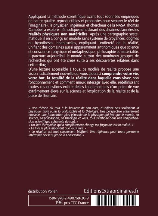 Vivons-nous dans une réalité virtuelle ? Ce dernier livre de la trilogie apporte les explications détaillées sur le fonctionnement de notre réalité, et notre place dans l'univers. Il propose un modèle détaillé et des explications claires et simples sur la mécanique de la réalité non-physique qui définit l’ultime frontière : l’espace intérieur. Comment fonctionne le temps ? Si la réalité est virtuelle, comment est-elle calculée ? Comment expliquer les phénomènes psi ? Quelles sont les conséquences pour nous, au quotidien ? Et surtout, comment savoir si tout cela est vrai ? Ce modèle de réalité vous aidera à comprendre votre vie, votre but, la totalité de la réalité dans laquelle vous vivez, son fonctionnement et comment mieux interagir avec elle. Une trilogie unifiant philosophie, physique et métaphysique.