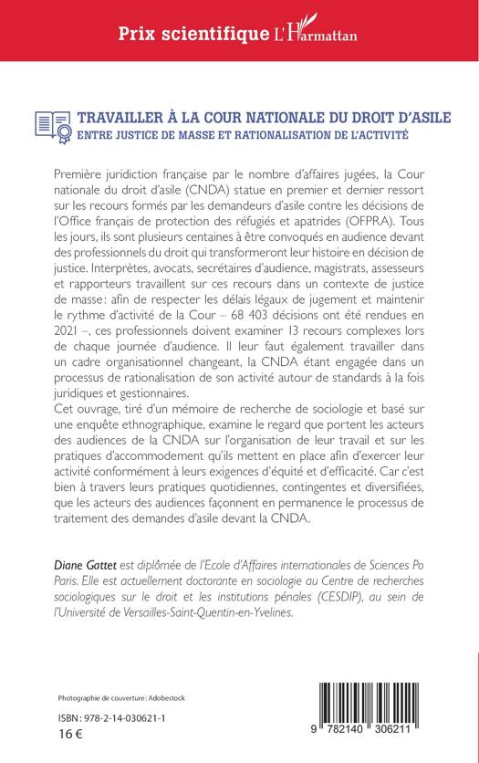 Première juridiction française par le nombre d'affaires jugées, la Cour nationale du droit d'asile (CNDA) statue en premier et dernier ressort sur les recours formés par les demandeurs d'asile contre les décisions de l'Office français de protection des réfugiés et apatrides (OFPRA). Tous les jours, ils sont plusieurs centaines à être convoqués en audience devant des professionnels du droit qui transformeront leur histoire en décision de justice. Interprètes, avocats, secrétaires d'audience, magistrats, assesseurs et rapporteurs travaillent sur ces recours dans un contexte de justice de masse afin de respecter les délais légaux de jugement et maintenir le rythme d'activité de la Cour - 68 403 décisions ont été rendues en 2021 -, ces professionnels doivent examiner 13 recours complexes lors de chaque journée d'audience. Il leur faut également travailler dans un cadre organisationnel changeant, la CNDA étant engagée dans un processus de rationalisation de son activité autour de standards à la fois juridiques et gestionnaires. Cet ouvrage, tiré d'un mémoire de recherche de sociologie et basé sur une enquête ethnographique, examine le regard que portent les acteurs des audiences de la CNDA sur l'organisation de leur travail et sur les pratiques d'accommodement qu'ils mettent en place afin d'exercer leur activité conformément à leurs exigences d'équité et d'efficacité. Car c'est bien à travers leurs pratiques quotidiennes, contingentes et diversifiées, que les acteurs des audiences façonnent en permanence le processus de traitement des demandes d'asile devant la CNDA.