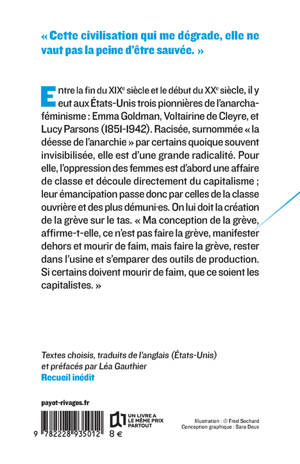 Entre la fin du XIXe siècle et le début du XXe siècle, il y eut aux États-Unis trois pionnières de l'anarcha-féminisme : Emma Goldman, Voltairine de Cleyre, et Lucy Parsons (1851-1942). Racisée, surnommée « la déesse de l'anarchie » par certains quoique souvent invisibilisée, elle est d'une grande radicalité. Pour elle, l'oppression des femmes est d'abord une affaire de classe et découle directement du capitalisme ; leur émancipation passe donc par celles de la classe ouvrière et des plus démuni·es. On lui doit la création de la grève sur le tas. « Ma conception de la grève, affirme-t-elle, ce n'est pas faire la grève, manifester dehors et mourir de faim, mais faire la grève, rester dans l'usine et s'emparer des outils de production. Si certains doivent mourir de faim, que ce soient les capitalistes. »