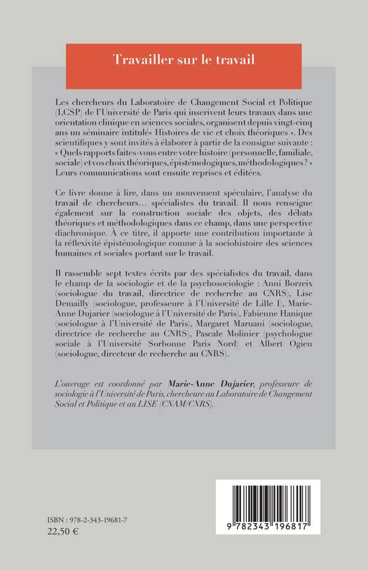 Ce livre donne à lire, dans un mouvement spéculaire, l'analyse du travail des chercheurs... spécialistes du travail. Il nous renseigne également sur la construction sociale des objets, des débats théoriques et méthodologiques dans ce champ, dans une perspective diachronique. A ce titre, il apporte une contribution importante à la réflexivité épistémologique comme à la sociohistoire des sciences humaines et sociales portant sur le travail. Il rassemble sept textes écrits par des spécialistes du travail, dans le champ de la sociologie et de la psychosociologie.