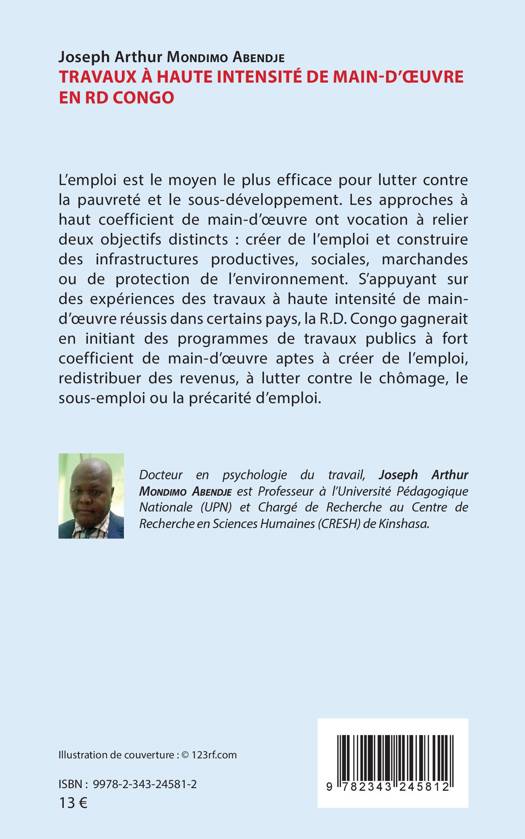 L'emploi est le moyen le plus efficace pour lutter contre la pauvreté et le sous-développement. Les approches à haut coefficient de main-d'oeuvre ont vocation à relier deux objectifs distincts : créer de l'emploi et construire des infrastructures productives, sociales, marchandes ou de protection de l'environnement. S'appuyant sur des expériences des travaux à haute intensité de main d'oeuvre réussis dans certains pays, la R.D. Congo gagnerait en initiant des programmes de travaux publics à fort coefficient de main-d'oeuvre aptes à créer de l'emploi, redistribuer des revenus, à lutter contre le chômage, le sous-emploi ou la précarité d'emploi.