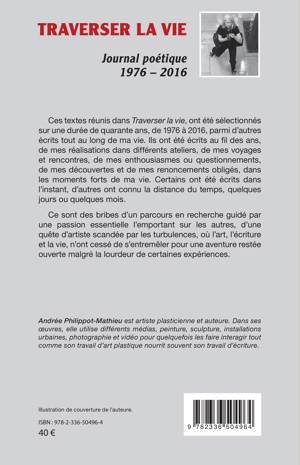 Ces textes réunis dans Traverser la vie, ont été sélectionnés sur une durée de quarante ans, de 1976 à 2016, parmi d'autres écrits tout au long de ma vie. Ils ont été écrits au fil des ans, de mes réalisations dans différents ateliers, de mes voyages et rencontres, de mes enthousiasmes ou questionnements, de mes découvertes et de mes renoncements obligés, dans les moments forts de ma vie. Certains ont été écrits dans l'instant, d'autres ont connu la distance du temps, quelques jours ou quelques mois. Ce sont des bribes d'un parcours en recherche guidé par une passion essentielle l'emportant sur les autres, d'une quête d'artiste scandée par les turbulences, où l'art, l'écriture et la vie, n'ont cessé de s'entremêler pour une aventure restée ouverte malgré la lourdeur de certaines expériences.