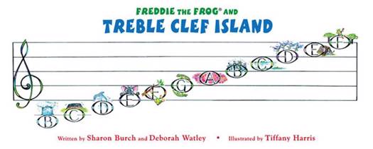 (Mystic Publishing/Freddie Frog). Corresponding poster to Freddie the Frog's adventures on Treble Clef Island, Freddie the Frog and the Thump in the Night and Freddie the Frog and the Secret of Crater Island . Question side is black and white. The colorful illustrated answer side includes twelve line and space treble clef notes: B below the staff, middle C, space D, E, F, G, A, B, C, D, E, and line F. 10-1/4 x 25-1/2
