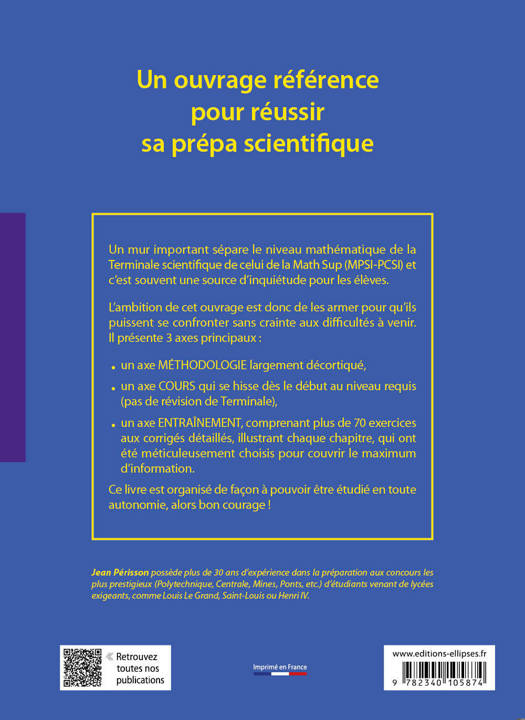 Un mur important sépare le niveau mathématique de la Terminale scientifique de celui de la Math Sup et c’est souvent une source d’inquiétude pour les élèves. L’ambition de cet ouvrage est donc de les armer pour qu’ils puissent se confronter sans crainte aux difficultés à venir.