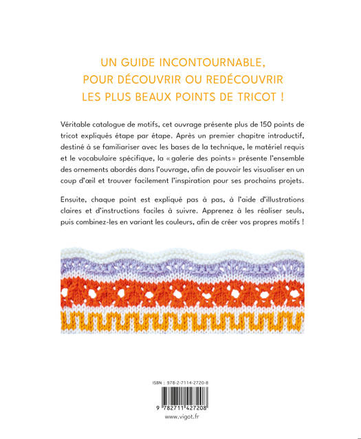 Véritable catalogue de motifs, cet ouvrage présente plus de 150 points de tricot expliqués étape par étape. Après un premier chapitre introductif, destiné à se familiariser avec les bases de la technique, le matériel requis et le vocabulaire spécifique, la « galerie des points » présente l’ensemble des ornements abordés dans l’ouvrage, afin de pouvoir les visualiser en un coup d’œil et trouver facilement l’inspiration pour ses prochains projets. Ensuite, chaque point est expliqué pas à pas, à l’aide d’illustrations claires et d’instructions faciles à suivre. Apprenez à les réaliser seuls, puis combinez-les en variant les couleurs, afin de créer vos propres motifs !