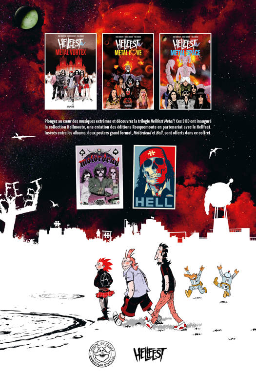 Plongez au cœur des musiques extrêmes et découvrez la trilogie Hellfest Metal : Hellfest Metal Vortex, Hellfest Metal Love et Hellfest Metal Space avec Jorge Bernstein et Fabrice Hodecent au scénario et Pixel Vengeur au dessin ! Ces 3 BD ont inauguré la collection Hellmoute, une création des éditions Rouquemoute en partenariat avec le Hellfest. Insérés entre les albums, deux posters grand format, Motördead et Hell, sont offerts dans ce coffret.