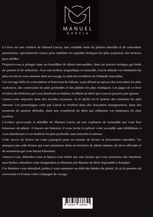 Ce livre est une création de Manuel Garcia, une véritable mine de plaisirs interdits et de rencontres passionnées, spécialement conçue pour satisfaire les appétits érotiques les plus audacieux des lecteurs gays adultes.Prépare-toi à te plonger dans un tourbillon de désirs inavouables, dans un univers érotique qui brûle de passion et de séduction. Avec son écriture magnétique et sensuelle, Garcia stimule tes fantasmes les plus secrets, t'emmenant dans un voyage au-delà des frontières de l'intimité masculine.Cet ouvrage défie les conventions et brise tous les tabous, t'offrant un aperçu des rencontres les plus explosives, des connexions les plus profondes et des plaisirs les plus extatiques. Les pages de ce livre révèlent des histoires qui te tiendront collé aux mots, éveillant un désir que tu ne pourras pas ignorer.Laisse-toi emporter dans des mondes inconnus, où le péché est le moteur des émotions les plus intenses. Les personnages créés par García se révèlent dans des rencontres transgressives, dans des moments de passion débridée, dans une symphonie de désir qui enflamme tes fantasmes les plus sombres.L'écriture provocante et détaillée de Manuel García est une explosion de sensualité qui te fera frissonner de plaisir. À travers ses histoires, il t'invite à explorer ta sexualité sans inhibitions, à t'abandonner à tes instincts les plus profonds, sans remords ni retenue.Cette oeuvre de fiction est ton passeport pour un monde de luxure et d'aventures interdites. Ne manque pas cette lecture qui t'emmènera dans un territoire de plaisir intense, de rêves effrontés et de sensations qui te feront frissonner.Assieds-toi, détends-toi et laisse-toi aller à une lecture qui te procurera des émotions sans limites, stimulera ton imagination et allumera une flamme de désir qui ne peut être apprivoisée.Ces histoires t'attendent, prêtes à t'emmener au-delà des limites du plaisir, là où la passion est souveraine et où l'extase est ton compagnon de voyage.