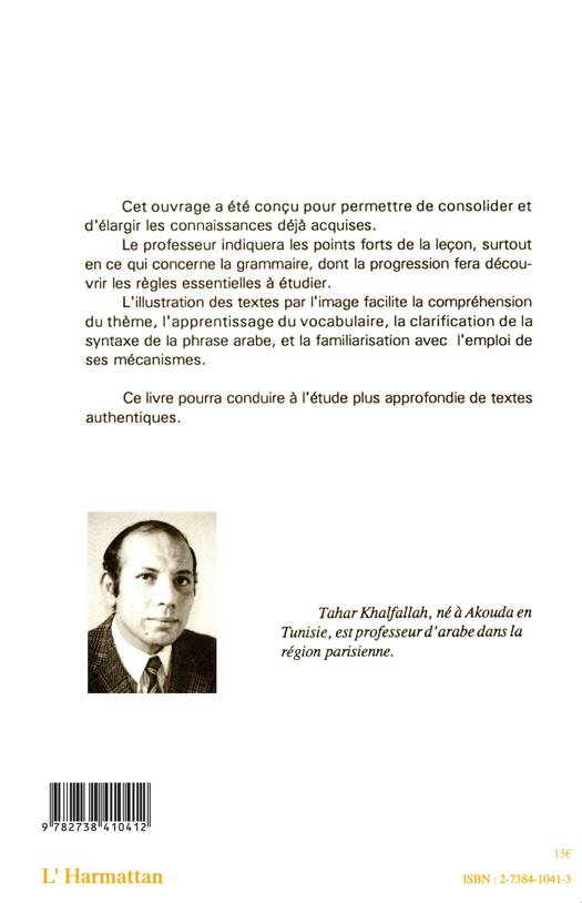Cet ouvrage a été conçu pour permettre de consolider et d'élargir les connaissances déjà acquises. Le professeur indiquera les points forts de la leçon, surtout en ce qui concerne la grammaire, dont la progression fera découvrir les règles essentielles à étudier. L'illustration des textes par l'image facilite la compréhension du thème, l'apprentissage du vocabulaire, la clarification de la syntaxe de la phrase arabe, et la familiarisation avec l'emploi de ses mécanismes. Ce livre pourra conduire à l'étude plus approfondie de textes authentiques.