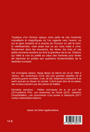Tryptique d’un Horizon aperçu nous parle de ces moments inquiétants et magnifiques où l’on regarde vers l’avenir, où sur la ligne lointaine et si proche de l’horizon on sait la mort, le vieillissement, mais aussi tout ce qui nous reste à vivre. Reviennent alors les souvenirs, les rêves, les rires et ces petits moments anodins qui font la grandeur de la vie. Oratorio qui mêle la voix du poète au coeur des hommes pour tenter de répondre en poésie aux questions fondamentales de la destinée humaine.