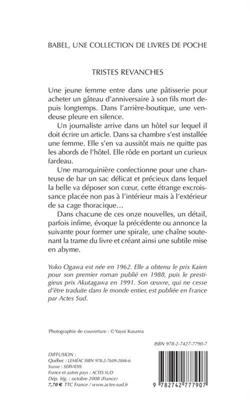 Une jeune femme entre dans une pâtisserie pour acheter un gâteau d'anniversaire à son fils mort depuis longtemps. Dans l'arrière-boutique, une vendeuse pleure en silence. Un journaliste arrive dans un hôtel sur lequel il doit écrire un article. Dans sa chambre s'est installée une femme. Elle s'en va aussitôt mais ne quitte pas les abords de l'hôtel. Elle rôde en portant un curieux fardeau. Une maroquinière confectionne pour une chanteuse de bar un sac délicat et précieux dans lequel la belle va déposer son coeur, cette étrange excroissance placée non pas à l'intérieur mais à l'extérieur de sa cage thoracique... Dans chacune de ces onze nouvelles, un détail, parfois infime, évoque la précédente ou annonce la suivante pour former une spirale, une chaîne soutenant la trame du livre et créant ainsi une subtile mise en abyme. «Yoko Ogawa est née en 1962. Elle a obtenu le prix Kaien pour son premier roman publié en 1988, puis le prestigieux prix Akutagawa en 1991. Son oeuvre, qui ne cesse d'être traduite dans le monde entier, est publiée en France par Actes Sud.»