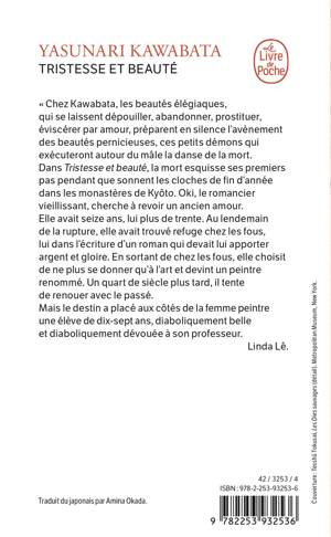 Chez Kawabata, les beautés élégiaques, qui se laissent dépouiller, abandonner, prostituer, éviscérer par amour, préparent en silence l’avènement des beautés pernicieuses, ces petits démons qui exécuteront autour du mâle la danse de la mort. Dans Tristesse et beauté, la mort esquisse ses premiers pas pendant que sonnent les cloches de fin d’année dans les monastères de Kyôto. Oki, le romancier vieillissant, cherche à revoir un ancien amour. Elle avait seize ans, lui plus de trente. Au lendemain de la rupture, elle avait trouvé refuge chez les fous, lui dans l’écriture d’un roman qui devait lui apporter argent et gloire. En sortant de chez les fous, elle choisit de ne plus se donner qu’à l’art et devint peintre renommé. Un quart de siècle plus tard, il tente de renouer avec le passé. Mais le destin a placé aux côtés de la femme peintre une élève de dix-sept ans, diaboliquement belle et diaboliquement dévouée à son professeur.