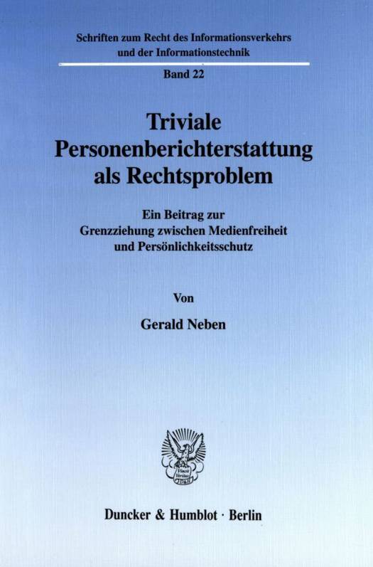 Im ersten Teil schafft Gerald Neben die rechtstatsächlichen Grundlagen der anschließenden rechtswissenschaftlichen Befassung. Hier wird der Untersuchungsgegenstand abgegrenzt und in seiner publizistischen, soziologischen und ökonomischen Dimension erläutert. Sodann wendet sich der Autor der Frage nach Zulässigkeit und Grenzen der massenmedialen Personenberichterstattung zu. Aus der Rechtsprechung der vergangenen 10 Jahre werden verallgemeinerbare Entscheidungsprinzipien herausgearbeitet und aus verfassungsrechtlicher Perspektive hinterfragt. Dem gegenwärtigen Modell stellt der Autor einen eigenen, wertneutralen Ansatz zur Konfliktlösung gegenüber. Ein dritter Teil schließlich ist der Rechtsfolgenseite gewidmet. Hier wird zunächst die tatsächliche Effektivität des verfügbaren äußerungsrechtlichen Instrumentariums überprüft. Der Autor kommt zu dem Ergebnis, dass der staatlichen Pflicht zum Schutze der Persönlichkeit gegenwärtig nicht hinreichend entsprochen wird. Zur Behebung dieses Defizits schlägt er eine Fortentwicklung der monetären zivilrechtlichen Ansprüche und insbesondere des Bereicherungsrechts vor.