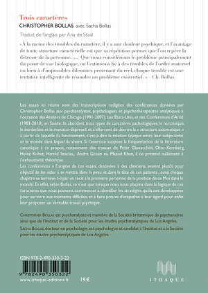 Série de conférences de Christopher Bollas, à propos de trois types de caractères pathologiques : le narcissique, le borderline et le maniaco-dépressif ; suivie d'un entretien avec Sacha Bollas.