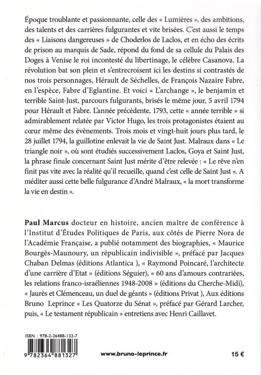 Epoque troublante et passionnante, celle des "Lumières", des ambitions, des talents et des carrières fulgurantes et vite brisées. C'est aussi le temps des "Liaisons dangereuses" de Choderlos de Laclos, et en écho des écrits de prison au marquis de Sade, répond du fond de sa cellule du Palais des Doges à Venise le roi incontesté du libertinage, le célèbre Casanova. La révolution bat son plein et s'entrecroisent ici les destins si contrastés de nos trois personnages, Hérault de Séchelles, de François Nazaire Fabre, en l'espèce, Fabre d'Eglantine. Et voici "L'archange", le benjamin et terrible Saint-Just, parcours fulgurants, brisés le même jour, 5 avril 1794 pour Hérault et Fabre. L'année précédente, 1793, cette "année terrible" si admirablement relatée par Victor Hugo, les trois protagonistes étaient au coeur même des événements. Trois mois et vingt-huit jours plus tard, le 28 juillet 1794, la guillotine enlevait la vie de Saint-Just. Malraux dans "Le triangle noir", où sont étudiés successivement Laclos, Goya et Saint-Just, la phrase finale concernant Saint-Just mérite d'être relevée : "Le rêve n'en finit pas vite avec la réalité qu'il recueille, quand c'est celle de Saint-Just". A méditer aussi cette belle fulgurance d'André Malraux, "la mort transforme le vie en destin".