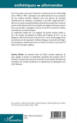 Ces trois essais écrits par l'historien et théoricien de l'art Alois Riegl entre 1900 et 1901 démontrent la puissance de son analyse formelle. Il parvient magistralement à décrire et rendre compréhensibles aussi bien les productions mineures que les chefs-d'uvre de l'art et à établir une logique historique à partir de ce qui semble y échapper, comme les uvres novatrices, isolées, retardatrices ou anachroniques. Cette édition bilingue permet de saisir au plus près le style et les concepts riegliens.