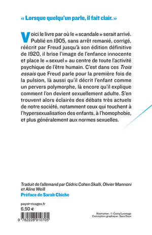 Voici le livre par où le « scandale » serait arrivé. Publié en 1905, sans arrêt remanié, corrigé, réécrit par Freud jusqu'à son édition définitive de 1920, il brise l'image de l'enfance innocente et place le « sexuel » au centre de toute l'activité psychique de l'être humain. C'est dans ces «Trois essais» que Freud parle pour la première fois de la pulsion, là aussi qu'il décrit l'enfant comme un pervers polymorphe, là encore qu'il explique comment l'on devient sexuellement adulte. S'en trouvent alors éclairés des débats très actuels de notre société, notamment ceux qui touchent à l'hypersexualisation des enfants, à l'homophobie, et plus généralement aux normes sexuelles.