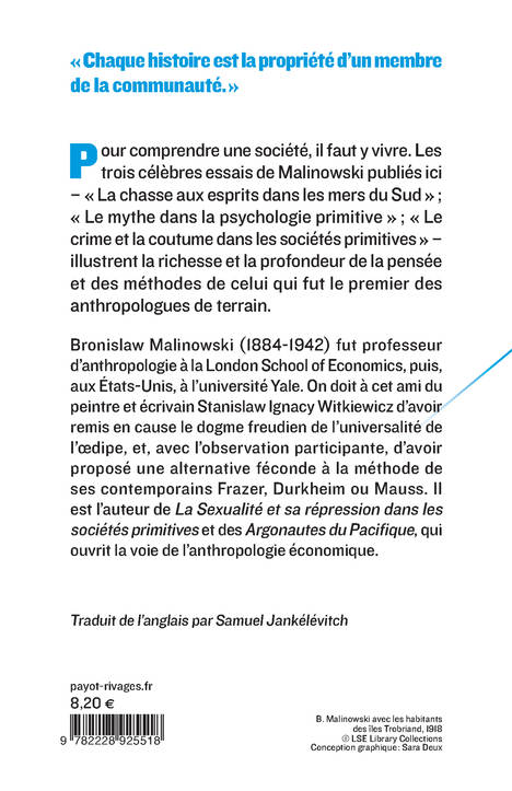 Pour comprendre une société, il faut y vivre. Les trois célèbres essais de Malinowski publiés ici - « La chasse aux esprits dans les mers du Sud » ; « Le mythe dans la psychologie primitive » ; « Le crime et la coutume dans les sociétés primitives » - illustrent la richesse et la profondeur de la pensée et des méthodes de celui qui fut le premier des anthropologues de terrain.