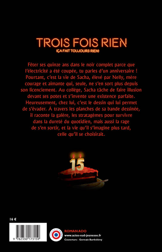 Fêter ses quinze ans dans le noir complet parce que l'électricité a été coupée, tu parles d'un anniversaire ! Pourtant, c'est la vie de Sacha, élevé par Nelly, mère courage et aimante qui, seule, ne s'en sort plus depuis son licenciement. Au collège, Sacha tâche de faire illusion devant ses potes et s'invente une existence parfaite. Heureusement, chez lui, c'est le dessin qui lui permet de s'évader. À travers les planches de sa bande dessinée, il raconte la galère, les stratagèmes pour survivre dans la dureté du quotidien, mais aussi la rage de s'en sortir, et la vie qu'il s'imagine plus tard, celle qu'il se choisirait.