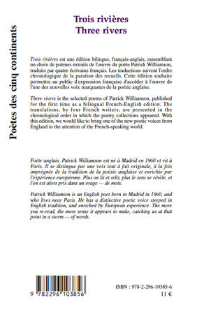 Trois rivières est une édition bilingue français-anglais, rassemblant des poèmes de Patrick Williamson, traduits par quatre écrivains français. Les traductions suivent l'ordre chronologique de la parution des recueils. Cette édition souhaite permettre au public d'expression française d'accéder à l'oeuvre de l'une des nouvelles voix marquantes de la poésie anglaise.
