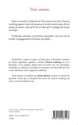 Dans ce recueil, à l'aube de ses Trois saisons sur terre, Francis Lamberg agence textes de jeunesse et écrits récents pour dire le temps qui passe, celui qu'il fait et celui qu'il conjugue de temps en temps. D'étreintes amicales en étreintes charnelles, c'est une vie de révolte, d'engagement et d'amour qui défile...